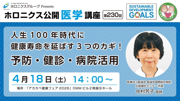 医療法人医誠会(本社:大阪府大阪市、代表者:谷 幸治)は、2026年4月18日(土)に開催される「アカカベ健康フェア2026」(主催:株式会社アカカベ)において、第230回ホロニクス公開医学講座の出張講座を実施します。健康寿命延伸をテーマに、生活習慣・健診・病院活用の具体策を医師が解説します。講座に加え、当日は無料の眼底検査や都市養蜂「医誠会ハニー」の取り組み紹介も行います。