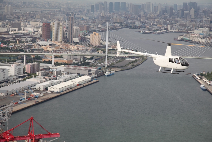 舞洲ヘリポート(大阪市此花区)から離陸し、大阪ベイエリアの上空を約7分間飛行します。