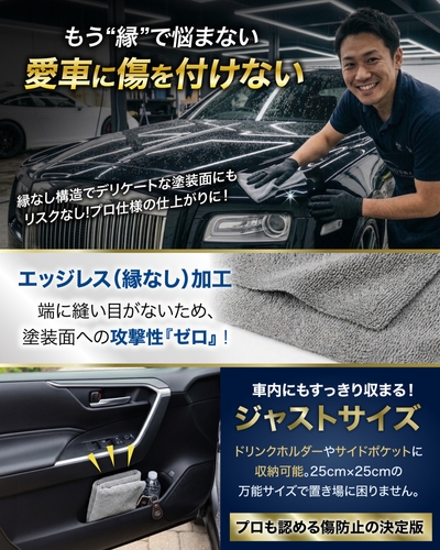 タオルの端に縫い目がない「エッジレス加工」を採用することで、デリケートな塗装面や傷つきやすいメッキ部分への攻撃性を「ゼロ」にしました。