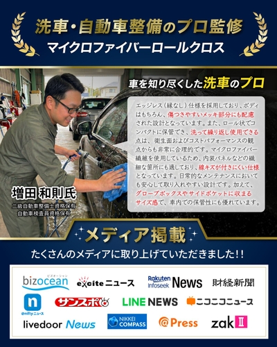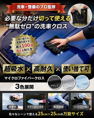 多数のメディアにも掲載された話題の「超吸水・高耐久・使い捨て」の機能性はそのままに、本製品は自動車整備士・Masuda Kenichi氏の監修のもと、洗車や車内清掃に最適な新カラーバリエーションと大容量モデルを追加しました。