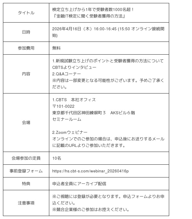 本セミナーでは、金融IT協会が検定を立ち上げた背景から受験者獲得に向けた戦略・具体施策、実際の成果までの事例や立ち上げのポイントをインタビュー形式でお伺いします。