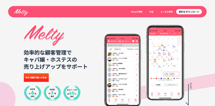 Meltyは、キャバクラやラウンジなど「夜の仕事」に従事するキャスト向けに特化した、顧客情報・売上・接客メモを管理するスマートフォンアプリです。来店時の会話や顧客の好みを記録し、リピート率向上や効率的な営業(連絡)を支援する、夜職女性の未来を応援する情報メディア(Melty公式サイト)も運営しています。