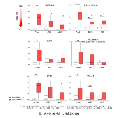 4週間のグルテン低減を行うと、腹部症状あり群では「腹部膨満感」「腹痛または不快感」「残便感」「急な排便要求」「硬い便」の5項目で有意に改善しました。また、「ゆるい便」の項目でも改善傾向でした(図3)。