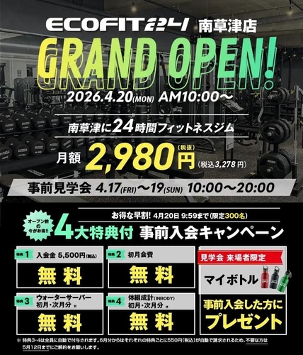 24時間フィットネスジム「エコフィット24」を展開するエーイーシー株式会社(本社:愛知県名古屋市、代表取締役:中村康宏)は、2026年4月20日(月)、滋賀県草津市追分南に、全国51店舗目となる「エコフィット24 南草津店」をオープンいたします。