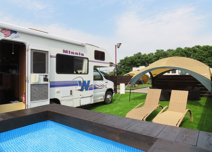 ③「グランピングBBQ」:キャンピングカー&プール付のプライベート空間