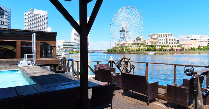 横浜港ボートパーク内、海に浮かぶカフェのデッキがBBQ会場です。ランドマークタワーや大観覧車「コスモクロック21」を目の前に、都会の喧騒を離れた「水上の特等席」で食事を楽しめます。