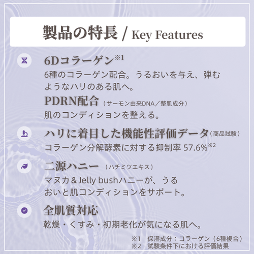 6Dコラーゲン、PDRN、二源ハニー(マヌカ&Jelly bushハニー)を配合した集中ケア用シートマスクです。乾燥、くすみ、年齢に応じた肌悩みが気になる肌に、うるおいとハリ感を与える設計です。シート素材には旭化成ベンリーゼ®アイスフェザーを採用し、優れた吸液性・保液性、軽薄・通気・高密着、生分解性・低刺激といった特長を備えています。<コラーゲン分解酵素抑制率57.6%>