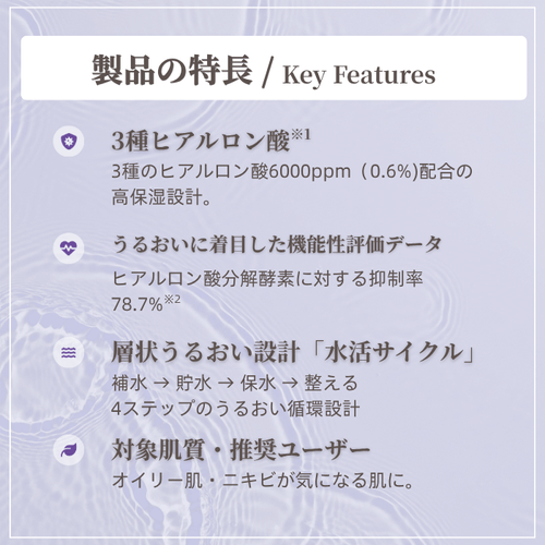 3種ヒアルロン酸6000ppm(0.6%)を配合し、補水・貯水・保水・整える「水活サイクル」設計を採用したシートマスクです。ニキビが気になる肌、敏感肌、オイリー肌、デリケートな肌に着目し、うるおいを与えて肌コンディションをサポートします。3Dサンドイッチ構造と北欧産100%植物繊維シートにより、高密着・低刺激・生分解性にも配慮しています。<ヒアルロン酸分解酵素抑制率78.7%>