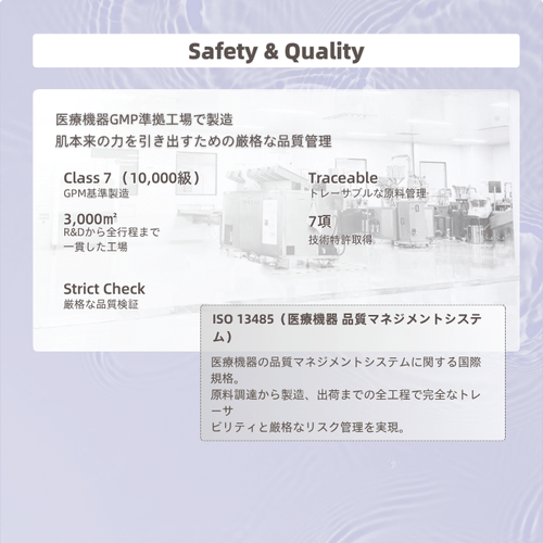 品質基準にはISO13485準拠品質基準を採用し、製造はClass7(10,000級)GMP基準クリーンルームで行っています。トレーサビリティや衛生管理にも配慮し、品質面からもデリケートな肌に向き合う製品づくりを進めています。