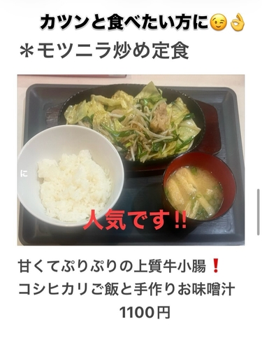 上質な牛小腸を使用したスタミナ満点の定食。コシヒカリのご飯と手作り味噌汁付き。
