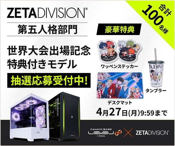 パソコン工房・グッドウィルを運営する株式会社ユニットコム(代表取締役:端田 泰三、本社:大阪市浪速区)は、iiyama PC ゲーミング PC シリーズ「LEVEL∞(レベル インフィニティ)」より、「ZETA DIVISION」第五人格部門の世界大会出場を記念して、2026年4月27日(月)9:59まで、合計100名様限定で「ZETA DIVISION 第五人格部門 特典付きモデル」の抽選販売応募を受付しております。