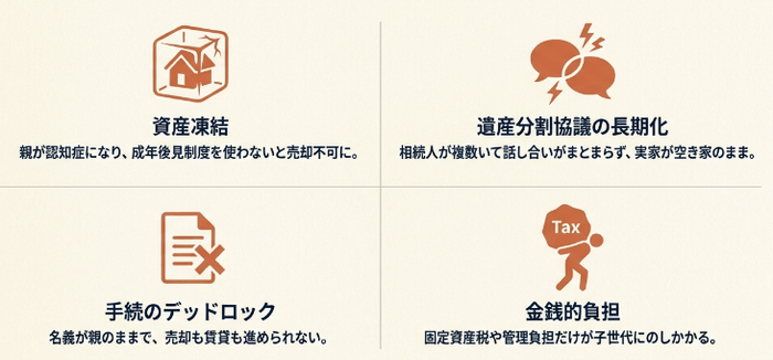 親の判断能力が低下すると、不動産の売却や契約ができなくなる「資産凍結」の状態に陥ります。こうなると、介護費用のために家を売ることすら困難になります。