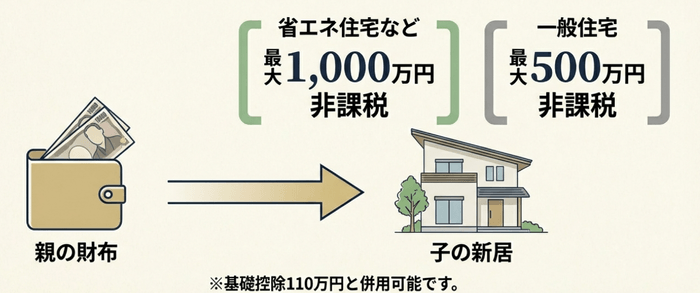 → 最大2,110万円まで贈与税がかかりません。