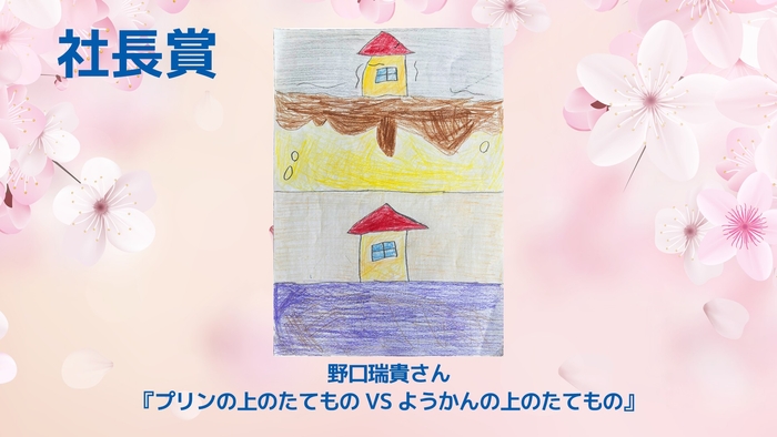 「社長賞」は、『プリンの上のたてもの VS ようかんの上のたてもの』を描いた野口瑞貴さん(小学3年生)が受賞。当日は姉の野口稟雅さんが代理で受け取りました。