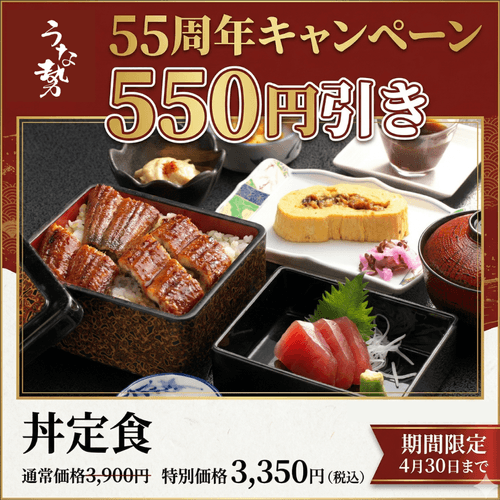 うな重をメインにお刺身・う巻き・粕漬けなど全7品を楽しめる、当店一番人気の「丼定食」を、創業55周年にちなんだ 550円引き でご提供いたします。