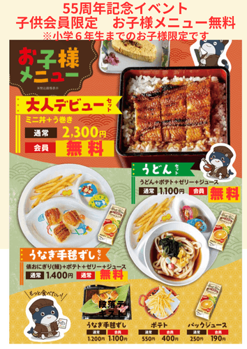 さらに、キッズ会員にご登録のお子様(小学6年生まで)は、キッズメニューが無料となります。ご家族揃ってうな勢へお越しください。