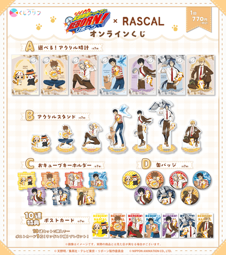 日本アニメーション株式会社(本社:東京都中央区、代表取締役社長:石川和子)がアニメーション制作・ライセンス展開を行う『ラスカル』とTVアニメ『家庭教師ヒットマンREBORN!』のコラボレーションが決定いたしました。2026年4月14日(火)10:00よりオンラインくじサービス「くじクリフ」にてコラボオンラインくじを販売いたします。とてもキュートな新規描き下ろしイラストグッズをぜひチェックしてください!