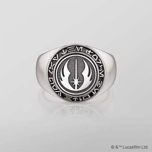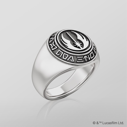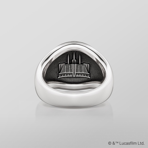 商品説明:ジェダイ・オーダーのエンブレムを立体的に表現したシグネットリング。側面には「MAY THE FORCE BE WITH YOU」のフレーズを、劇中と同じ「オーラベッシュ文字」でデザインとして取り入れています。凹凸部分にはいぶし加工を施し、日常使いしやすい落ち着いた質感に仕上げました。内側には「ジェダイ聖堂」を立体造形で再現し、世界観を細部まで鮮やかに表現。約1.7cmの幅で、手元に確かな存在感をもたらします。