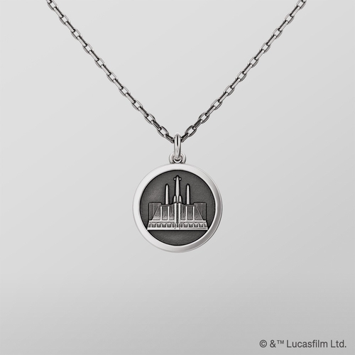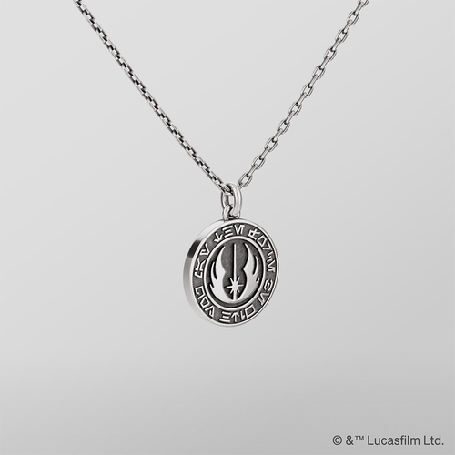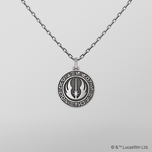 商品説明:「ジェダイ・オーダー」のエンブレムを浮彫りのように表現したネックレス。周囲には「MAY THE FORCE BE WITH YOU」のフレーズを「オーラベッシュ文字」で配置し、作品の象徴性を際立たせています。裏面には「ジェダイ聖堂」の立体造形を施し、ブランドならではの緻密な技術で世界観を丁寧に再現。いぶし加工によるクールな風合いで、日常にも取り入れやすいデザインです。トップのサイズは約1.6cm。