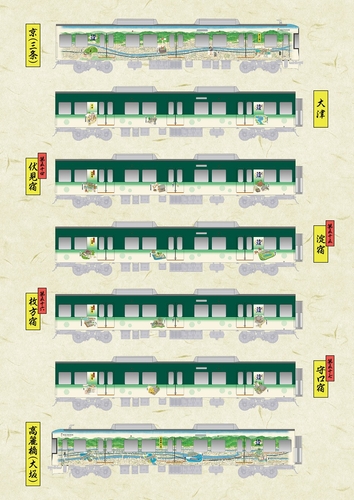 これを記念し、当時の「東海道五十七次」の世界観を鮮やかに描いたラッピング電車を運行します。車体デザインには、日本画の技法を基に「現代と昔が入り混じる世界」を浮世絵タッチで描くイラストレーター・武藤文昭氏を起用しました。通勤・通学や旅のひとときを、江戸時代の街道歩きの情緒と現代の感性が融合した、特別な空間へと誘います。