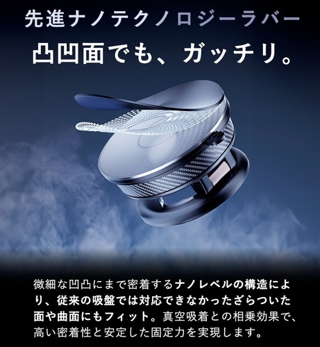 同社は、このような市場の課題に対応するため、独自の真空吸着メカニズムを採用しました。このメカニズムの核となるのは、吸着面の空気を完全に排除して真空状態を生成することです。さらに先進的なナノラバーテクノロジーにより、微細な凹凸にまで密着するナノレベル構造。従来の吸盤では対応できなかった曲面や凹凸にもフィットし、真空吸着との相乗効果を発揮します。