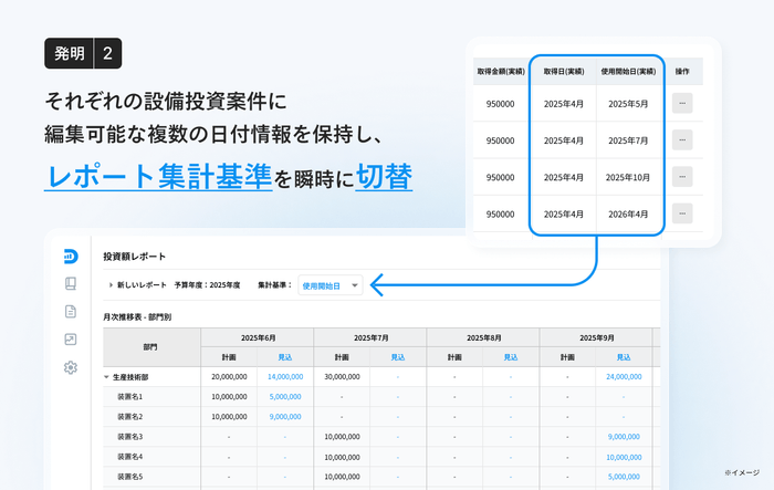 設備投資案件ごとに複数の日付項目(取得日・支払日・搬入日・検収日・使用開始日等)情報を保持し、レポートの集計基準となる起点をワンクリックで切り替えられる仕組みです。例えば、減価償却開始の基準となる「使用開始日」や、資金繰り管理上必要な「支払日」など、意思決定の目的に応じた数字を煩雑な手作業なしに出し分けることができます。