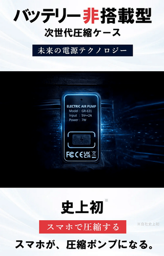 また、圧縮ケース内に電池を一切使用しない設計を採用しています。発火リスクがないため、国際線を含む飛行機の預け荷物として安心して使用できます。