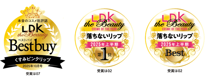 ※1 『LDK the Beauty』(株式会社普遊舎)受賞/デイジードール リップ スティーラー 02:2025年上半期ベストコスメ 落ちないリップ部門で1位、ベストバイW受賞、03:2025年3月号 深みカラーリップ部門でA評価、04:2025年4月号 ベージュリップ部門でA評価、06:2025年3月号 深みカラーリップ部門で1位、ベストバイW受賞、07:2026年1月号 くすみピンクリップ部門でベストコスメ2025受賞