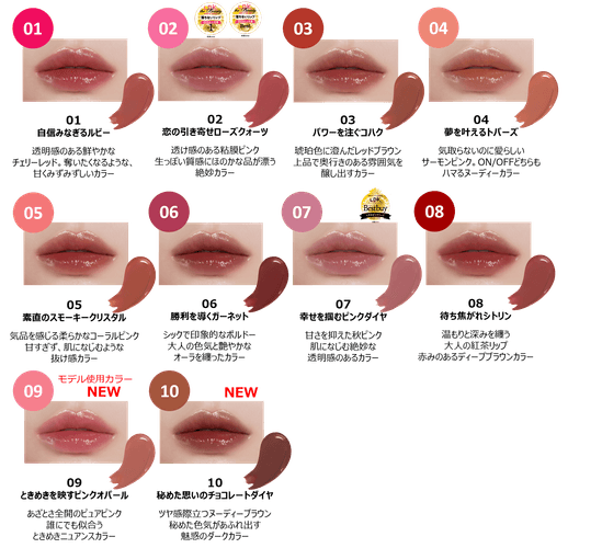この度加わるのは、あざとさ全開で透明感あふれるピュアピンク系の「09 ときめきを映すピンクオパール」と、ツヤ感際立つ大人なヌーディーブラウン系の「10 秘めた思いのチョコレートダイヤ」の2色。