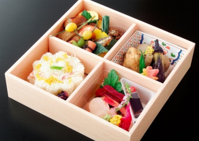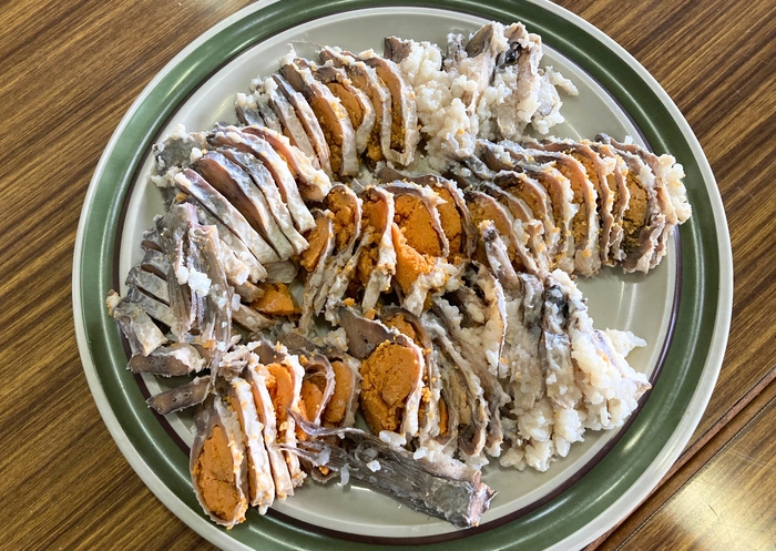 ②沖島で仕入れる、子持ちニゴロブナの「フナズシ」と日本料理「新月」のお弁当、湖魚や滋賀県産食材を取り入れたおつまみを味わえる!