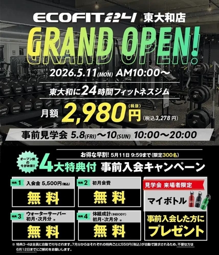 エーイーシー株式会社(本社:愛知県名古屋市、代表取締役:中村康宏)が展開する24時間フィットネスジム「エコフィット24」は、2026年5月11日(月)、東京都東大和市南街に「エコフィット24 東大和店」をグランドオープンいたします。