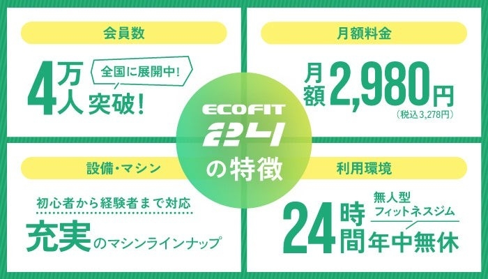 本出店により、エコフィット24は全国53店舗目となります。「エコフィット24」の累計会員数は4万人を突破しており、多くの方に支持されるフィットネスインフラとして成長を続けています。