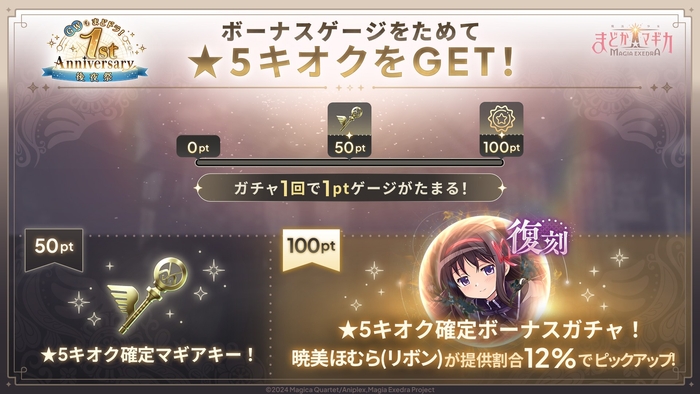 今回のガチャには「ボーナスゲージ」が付いており、ガチャ1回で1Ptゲージがたまります(10連ガチャで10Pt)。100Ptに達するとピックアップ対象も封入された★5キオク確定のボーナスガチャを1回引くことが可能です。