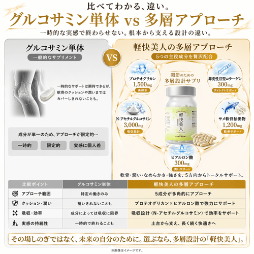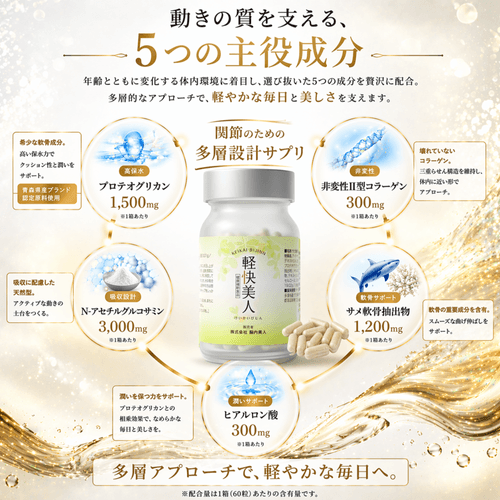 特に、階段の上り下りや長時間の歩行など、日々のスムーズな動きへの関心は、生活の質(QOL)を維持する上で非常に重要です。しかし、従来のサプリメントでは単一成分の配合に留まるものも多く、「どれを選べばいいかわからない」「実感が追いつかない」という声もありました。「軽快美人」は、そうした層に向けた「これ一択」を目指すフルスペック処方のサプリメントです。