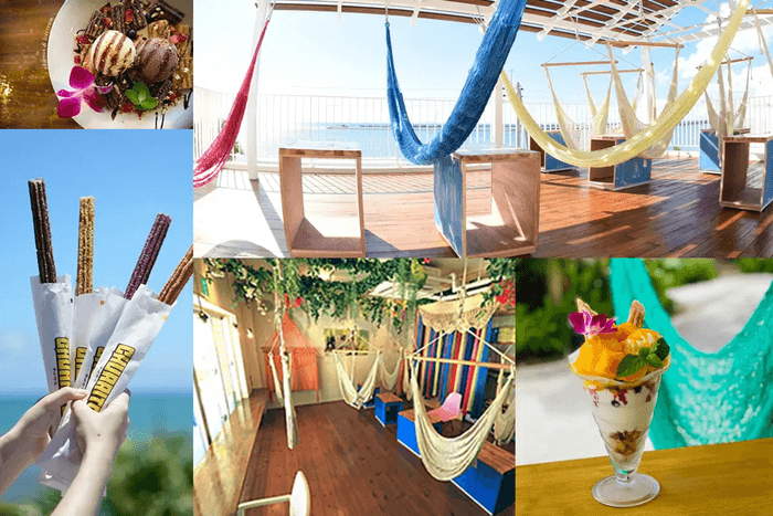 チュロスマンゴーパフェや、沖縄のフルーツをふんだんに使ったドリンクを、ハンモックに揺られながら楽しめるカフェです。