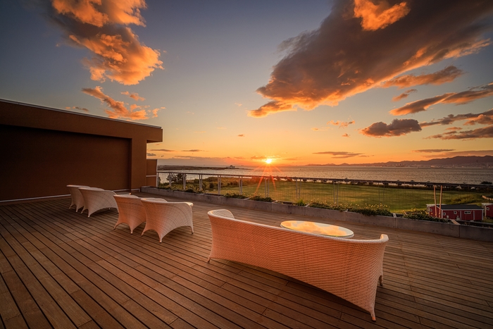 夕方には、日本夕陽百選に選ばれた舞洲ならではのロケーションの中で、大阪湾に沈む夕日の絶景が広がります。