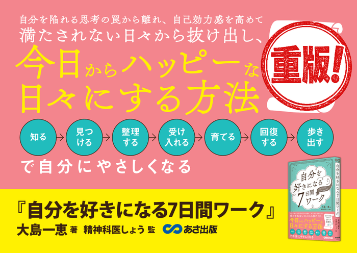 株式会社あさ出版(代表取締役:田賀井弘毅、所在地:東京都豊島区)は、大島一恵著 『自分を好きになる7日間ワーク』https://www.asa21.com/book/b672699.html について、2026年5月11日出来予定の重版を決定いたしましたので、お知らせいたします。