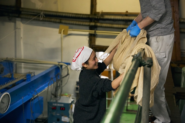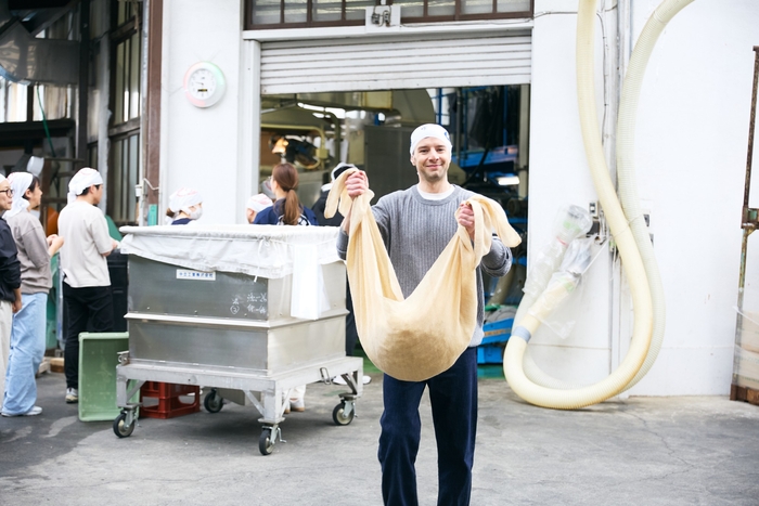 体験の核心は、蒸し上がったばかりのもち米を大きなざるに盛り、肩に担いでタンクまで運ぶ作業。もわっと広がる甘い蒸気、ずしりとした重さ、蔵に満ちる熱気——みりん造りの現場が初めて「自分ごと」になる瞬間を、参加者一人ひとりが全身で体感しました。