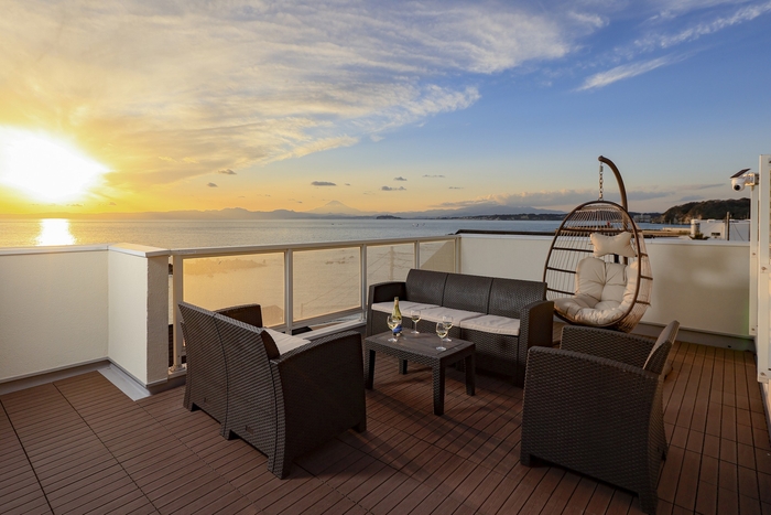 特に「Room A」の屋上テラスは当施設の最大の魅力で、森戸神社から江の島方面まで広がる美しい海岸線を一望でき、夕刻には黄金色に染まる海と、その先に浮かび上がる壮大な富士山のシルエットという、この地ならではのパノラマビューを特等席でお楽しみいただけます。