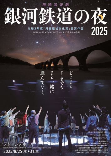 桜美林大学主催、群読音楽劇『銀河鉄道の夜 2025』が2025年8月25日 (月) 〜 8月31日 (日)に桜美林芸術文化ホール ストーンズホール(東京都町田市本町田2600-4)にて上演されます。 チケットはカンフェティ(運営:ロングランプランニング株式会社、東京都新宿区、代表取締役:榑松 大剛)にて発売中です。