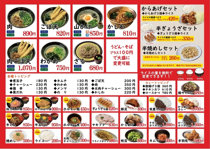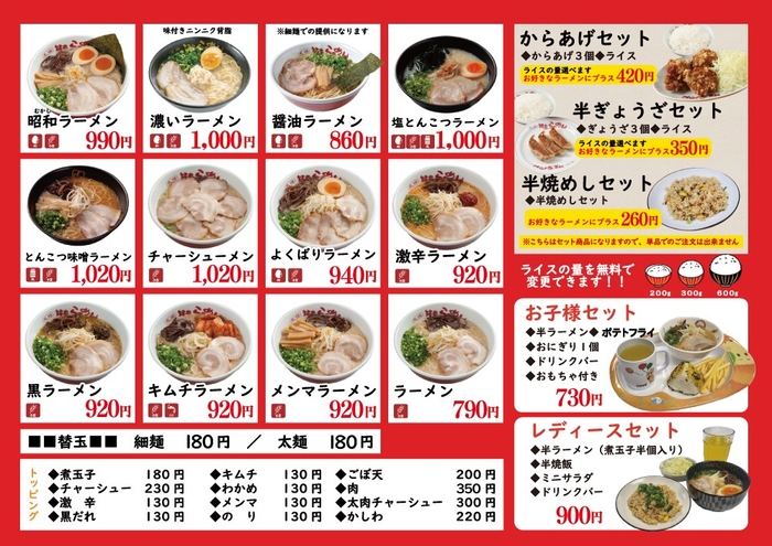 ※麺類:ラーメン、うどん、そば、(お子様セット、レディースセット含む)が対象商品です。
