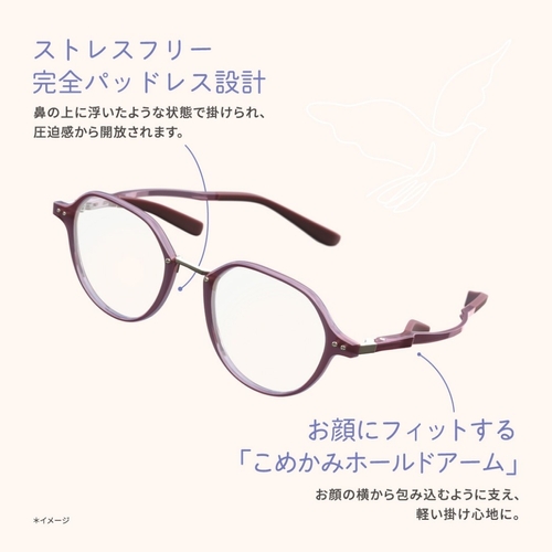 「POWANT(ポワント)」は、こうした課題を解消するため、つるの内側に「こめかみホールドアーム」を搭載しました。お顔の横から包み込むようにしてメガネを支えることで、鼻パッドに頼ることなくお顔にフィットさせることができます。