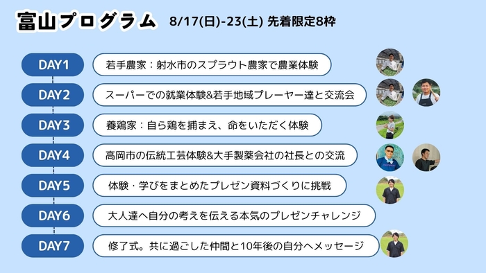 富山県全域を対象にした7日間のプログラム。農業体験や伝統工芸などを中心に活躍している”かっこいい大人”と出会うことができます。