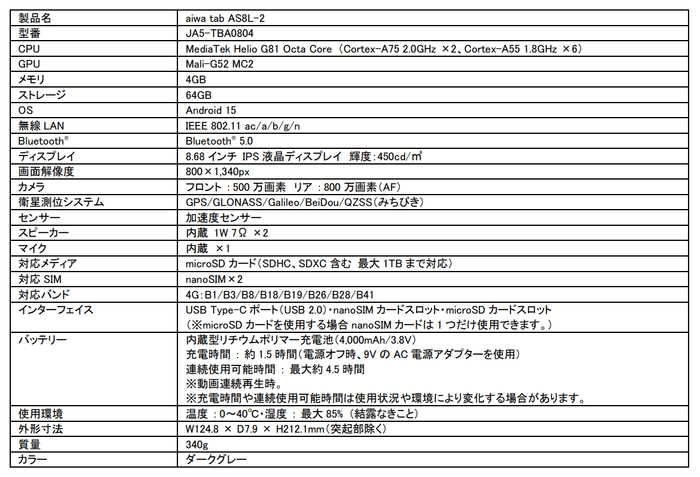 【aiwa tab AS8L-2主な仕様】