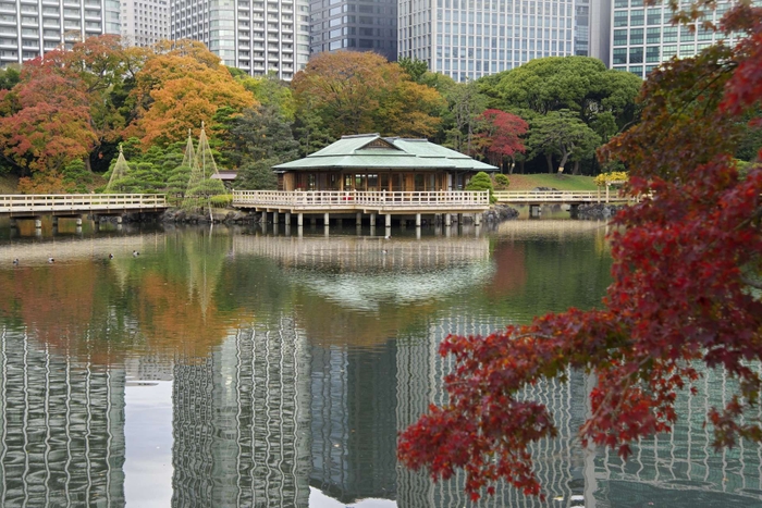 国指定特別名勝・特別史跡。承応3(1654)年に甲府宰相・松平綱重によって甲府浜屋敷としてつくられ、綱重の子・綱豊が6代将軍・徳川家宣になったのを機に、浜御殿と呼ばれる将軍家別邸となりました。以来、歴代将軍によって改修が行われ、11代将軍・家斉の時にほぼ現在の姿の庭園が完成しました。明治維新後は宮内庁所管の浜離宮となりました。