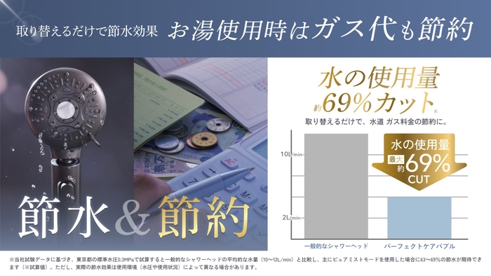 高機能シャワーヘッドでありながら、水の使用量を最大69%カット。水道代やガス代の節約にもつながり、家計に嬉しい効果をもたらします。特に寒くなる季節はついお湯を長く使いすぎてしまいがちですが、節水設計なら安心。美容ケアを楽しみながら、日々の水道代・ガス代を抑え、限られた資源を守るサステナブルな暮らしにも貢献します。