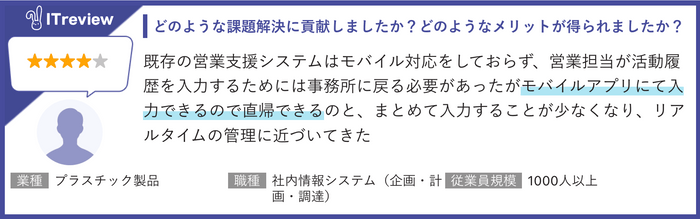 今回の「ITreview Grid Award 2025 Fall」は2025年9月までに掲載されたレビューの集計結果をもとに選定されています。「GENIEE SFA/CRM」を活用した営業進捗の可視化による社内での情報共有や会議の質の改善に関する高評価のコメントが多く寄せられました。また、モバイルアプリで外出先から入力できる点も評価されました。