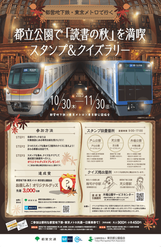 東京都交通局(東京都新宿区、交通局長:堀越 弥栄子)、東京地下鉄株式会社(本社:東京都台東区、代表取締役社長:小坂 彰洋、以下「東京メトロ」)、東京都建設局(東京都新宿区、建設局長:花井 徹夫)、公益財団法人東京都公園協会(本社:東京都新宿区、理事長:矢岡 俊樹、以下「東京都公園協会」)は、都営地下鉄×東京メトロ×東京都公園協会「都営地下鉄・東京メトロで行く都立公園で『読書の秋』を満喫スタンプ&クイズラリー」を2025年10月30日(木)から11月30日(日)まで合同で実施します。