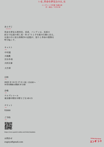 『いま、革命を夢見るのは、女』が2025年10月17日 (金)にテルプシコール(東京都 中野区 中野 3-49-15)にて上演されます。