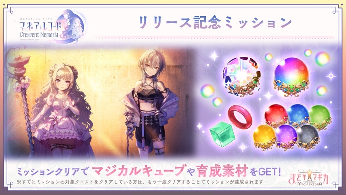 『Crescent Memoria』 開幕を記念して、「Crescent Memoria開幕記念ミッション」を開始いたしました。ログインや、「舞台装置の魔女」「魔獣編」MainのBOSSバトルクリアなどのミッションを達成することで、プリズムオーブやプリズムコアなどの育成素材や、マジカルキューブなどが獲得可能です。